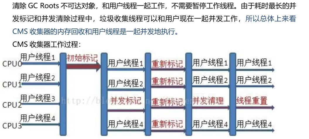 老年代的垃圾收集算法,主要目标是获取最短垃圾回收停顿时间,与其他老年代标记整理不同的是,这里使用的是多线程标记-清除算法,主要分为4个阶段: