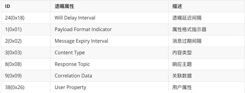 在 CONNECT 报文的 Payload 中,部分字段发生了变化,遗嘱消息(Will Message)变成了遗嘱载荷(Will Payload)。Payload 中新增了遗嘱属性(Will Properties),用于定义遗嘱消息的行为。