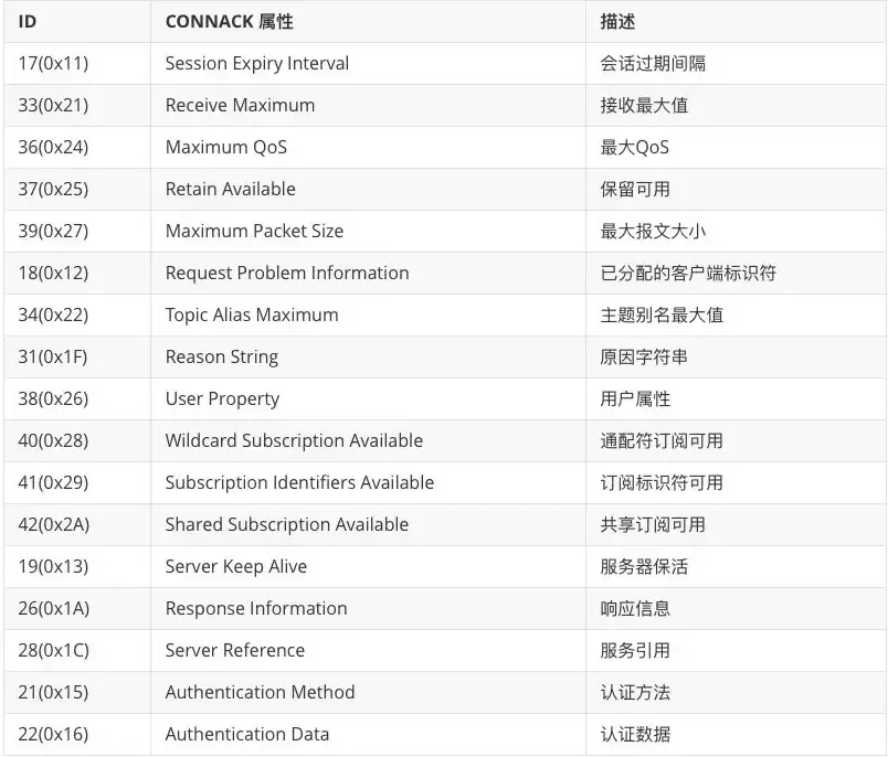 CONNACK 报文没有 Payload,在可变头部中包含的属性有: