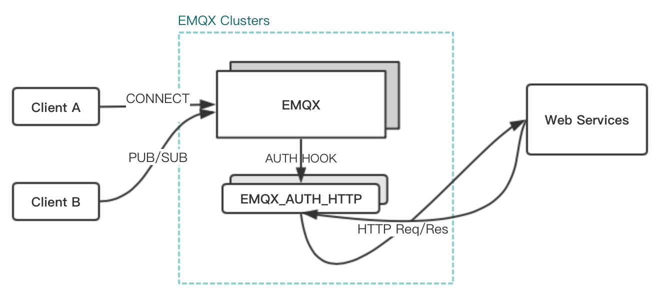 实际上,在 EMQX 的集群里面,emqx_auth_http 对于用户的 Web Services 来讲只是一个简单的、无状态的 HTTP Client,他只是将 EMQX 内部的登录认证、和ACL控制的请求转发到用户的 Web Services,并做一定逻辑处理而已。