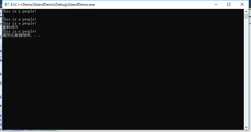 // SizeofDemo.cpp : 定义控制台应用程序的入口点。 // #include "stdafx.h" #include "SizeofDemo.h" using namespace std; People::People() { cout << "This is a people!" << endl; } People::~People() { } char People::walk() { cout << "sss"<<endl; return 0; } People People::operator+(const People&op_People) { cout << "重载成功" << endl; People mm; mm = op_People; return mm; } float People::getCount() { return 22.6; } int _tmain(int argc, _TCHAR* argv[]) { People * p_People = new People(); cout << sizeof(p_People->walk()) << endl; delete p_People; People cir_dd; People dd; People cir = cir_dd +dd; //测试重载 system("pause"); return 0; }运行结果: