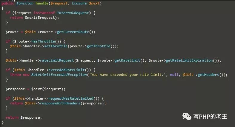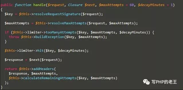 Illuminate\Routing\Middleware\ThrottleRequests代码如下: