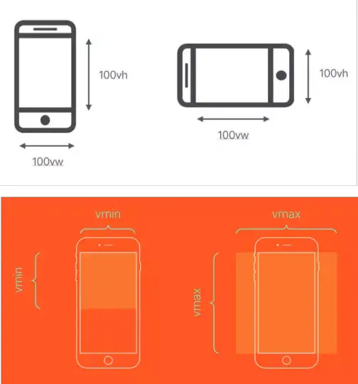 vw--- 1vw 等于视口宽度的 1%vh--- 1vh 等于视口高度的 1%vmin--- vw 和 vh 中的较小值vmax--- vw 和 vh 中的较大值