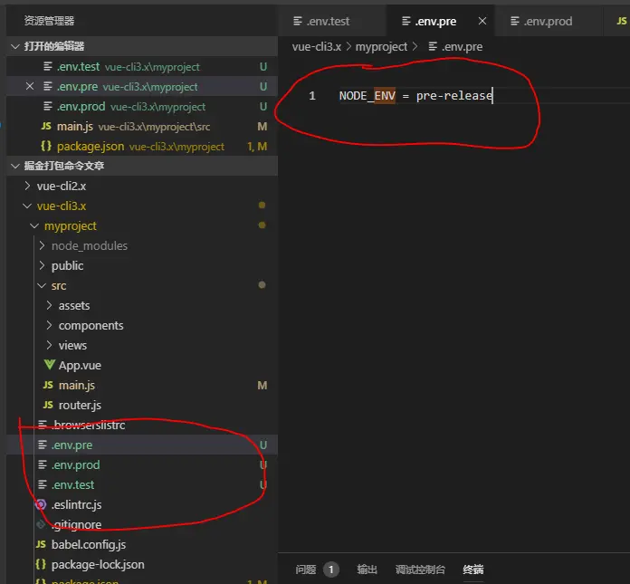 1,在项目根目录下新建3个文件,.env.test、.env.prod、.env.pre,在文件内分别写入NODE_ENV = testing、NODE_ENV = production、NODE_ENV = pre-release。