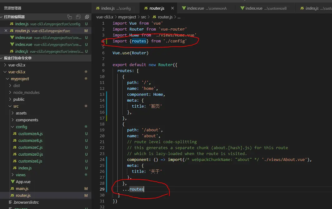 这步比较重要,首先我们在不同的配置中引入了不同的页面,通用页面之所以引入到了配置文件内,考虑到实际开发中有可能存在客户不需要这个功能,方便新加和删除。入口文件的作用是在之后的开发中我们只需要引入配置入口文件就可以了,当切换定制版的时候只需要修改入口文件就可以实现切换,方便快捷,如果说在需要配置文件的直接引用配置文件,那当我们切换定制版的时候改起来就是个很耗费精力的一件事了,所以入口文件在这里主要起个代理作用
