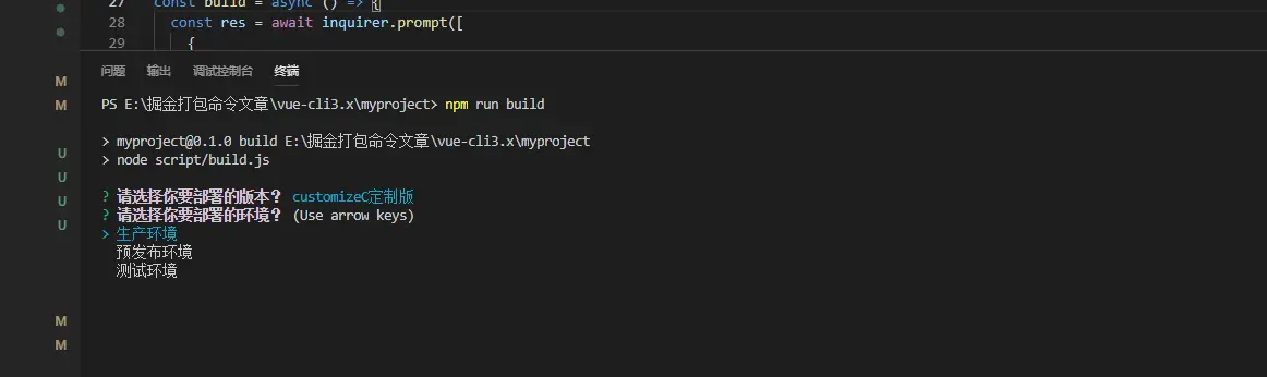 8,再npm install -D shelljs inquirer chalk,shelljs是用来执行命令的,inquirer是用来写交互式命令行的,chalk是用来装扮命令行命令的(比如在命令行输入个红色的字)。说一下我们想要实现的效果,当我们在运行npm run build的时候,我希望可以让我来选择我要部署什么样的版本,部署那个环境,我选择完成之后,它帮我修改我的配置文件修改完成之后再运行vue的打包命令进行打包。