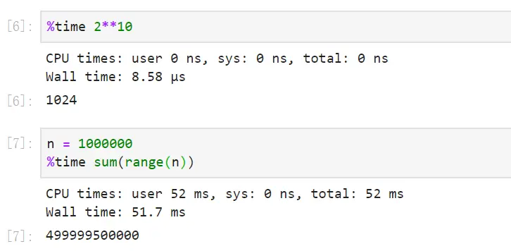 通常我们都需要考虑代码的执行时间,在 notebook 中可以有两个时间魔法命令 %time 和 %timeit,它们都有行和单元两种模式