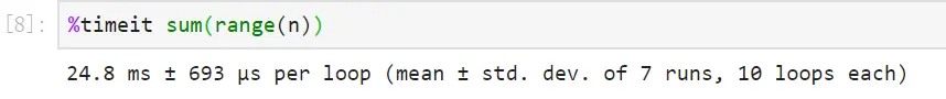 %timeit 和 %time 的区别在于,它会对给定代码运行多次,并计算一个平均时间,可以通过添加参数 -n 来指定运行的次数,如果没有指定,则会自动选择一个最佳的数量。例子如下所示: