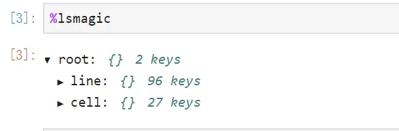 想了解可用的魔法命令,可以输入命令 %lsmagic ,输出结果如下所示,可以看到确实分为 line 和 cell 两类,并且分别给出命令的数量。