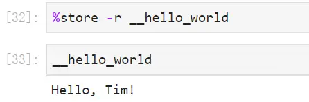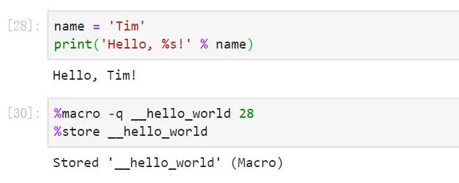 首先是写好一个代码单元,主要作用就是输出 Hello, name!,其中 name 也是定义好的一个变量,然后利用命令 %macro 来保存宏命令,名字是 __hello_world ,而 28 表示的就是上一个运行顺序为 28 的代码单元,即 In [28] 对应的代码单元,然后 %store 是保存宏命令。