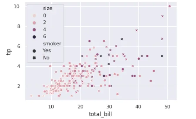添加 smoker 后,我们可以看到每个数据点都根据是否划分为两种颜色的数据点,展示的信息就更加丰富了。我们再进一步,加入属性 size 作为颜色的划分,而 smoker 作为样式,如下所示: