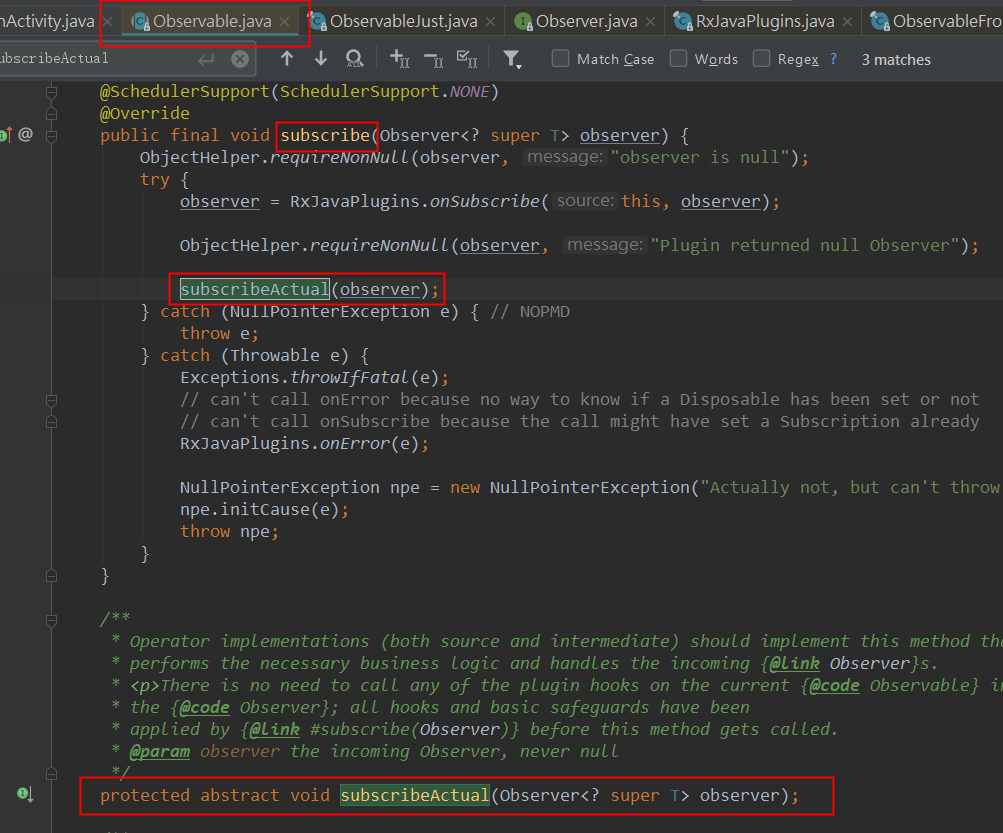 构造方法中对传入的数据进行了从新赋值,这就使得我们控制了对象的不可变性,我们进行的 Intermediate中间操作只是对 ObservableJust类中的变量value进行操作,并不会影响传入的参数值。从下图 可以看出,ObservableJust中subscribeActual(Observer<? super T> s)方法是基类 Observable中的抽象方法实现。Observable在重写了ObservableSource接口中的方法subscribe(Observer<? super T> observer)时调用subscribeActual(observer);在ObservableJust中我们具体实现了subscribeActual(Observer<? super T> s)方法。s.onSubscribe(sd);给了观察者一个中断器 ScalarDisposable sd.run();方法将调用Observer接口中的onNext方法回调数据。