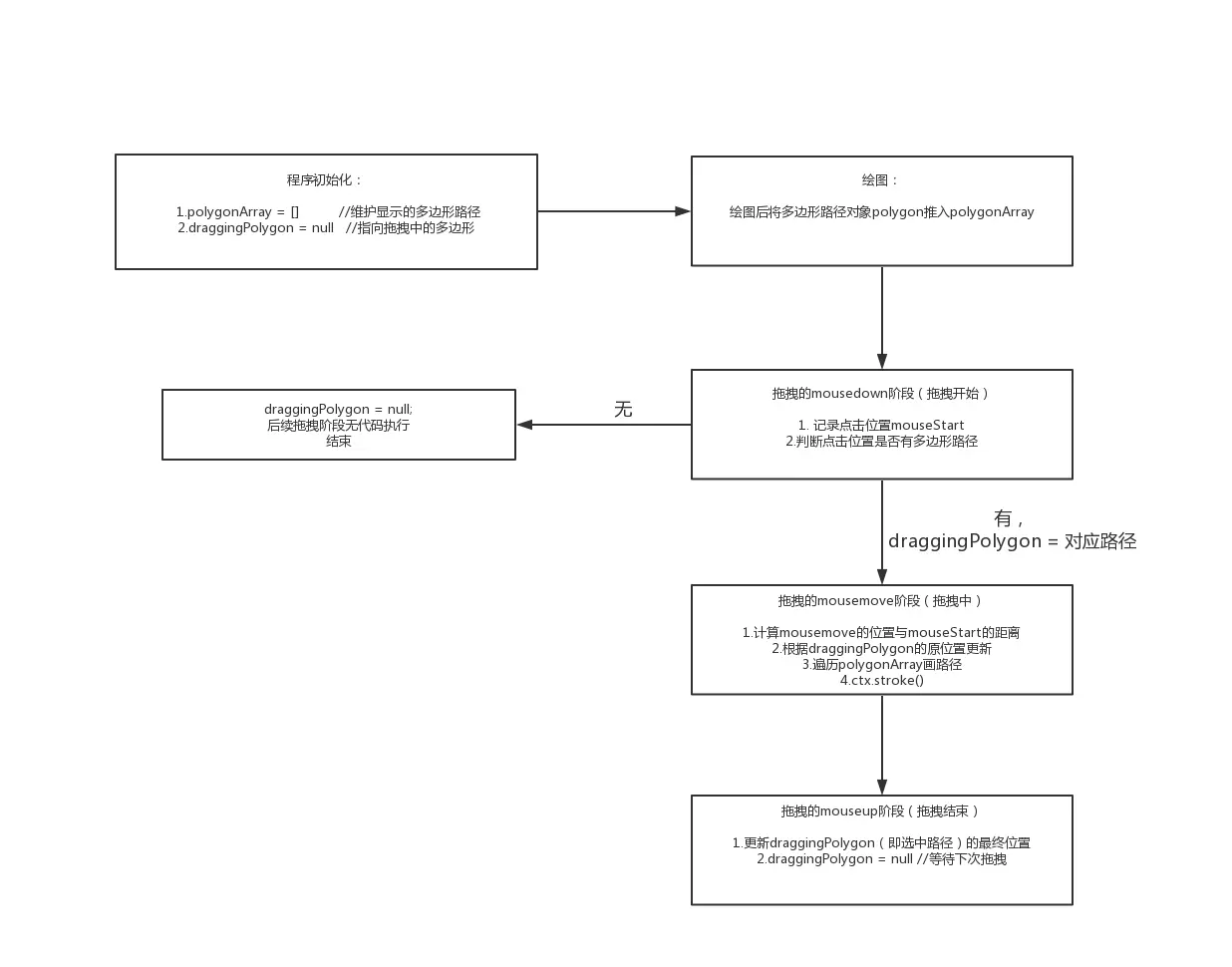 拖拽完成后是处于mouseup阶段,此时我们已经确定dragginPolygon的最终位置,进行更新即可,最后置为null,排除在没有拖拽多边形情况下,鼠标在画布上移动触发对应代码