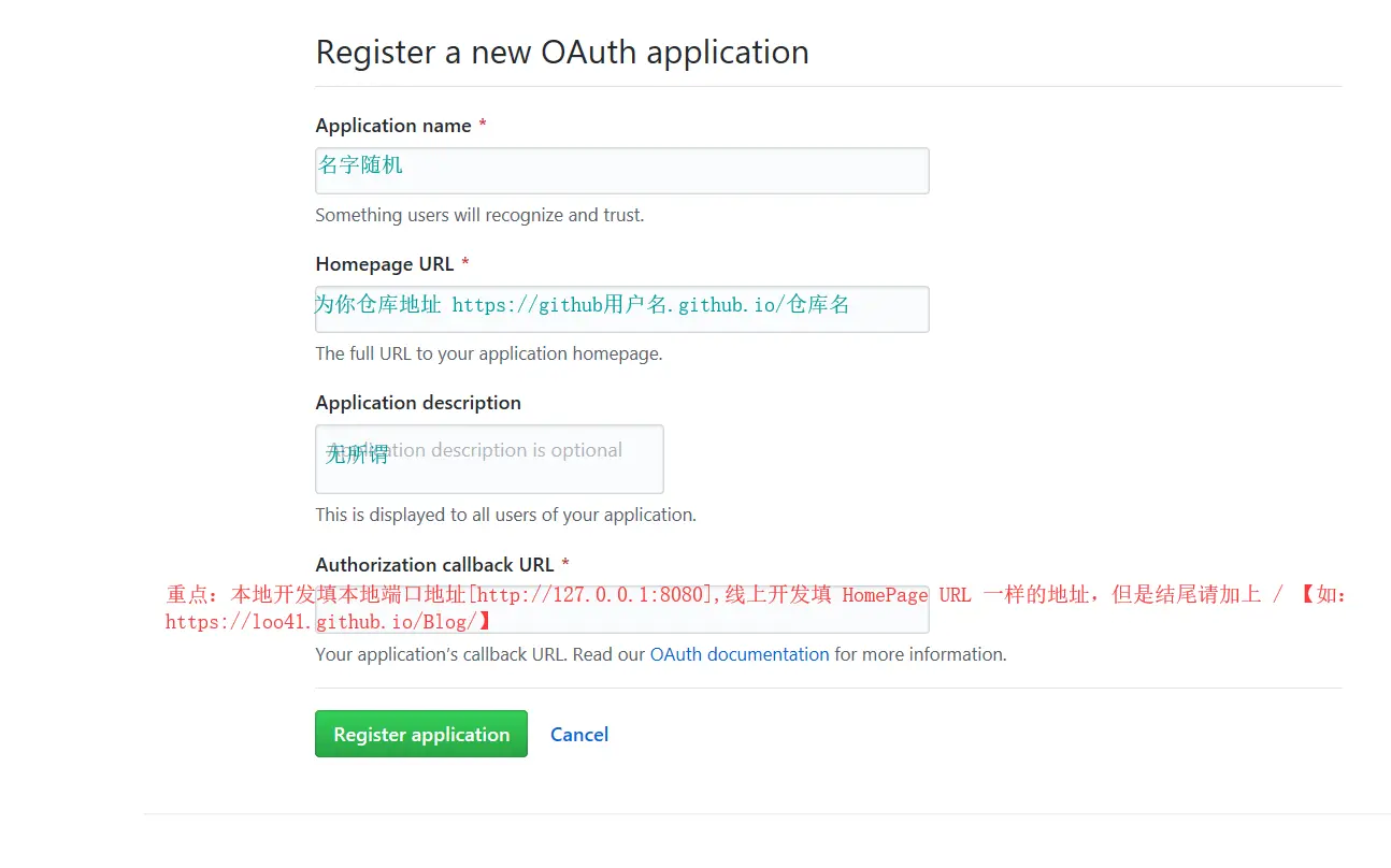 - 创建一个 OAuth application,重点如下图