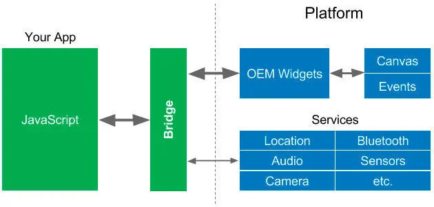 UI通过WebView来显示html代码,系统服务则通过一个中间层桥接到JaveScript中去。