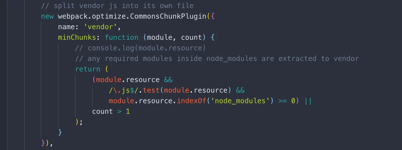 回到webpack打包配置部份,找到公共代码抽离部份,可以发现CommonChunkPlugin