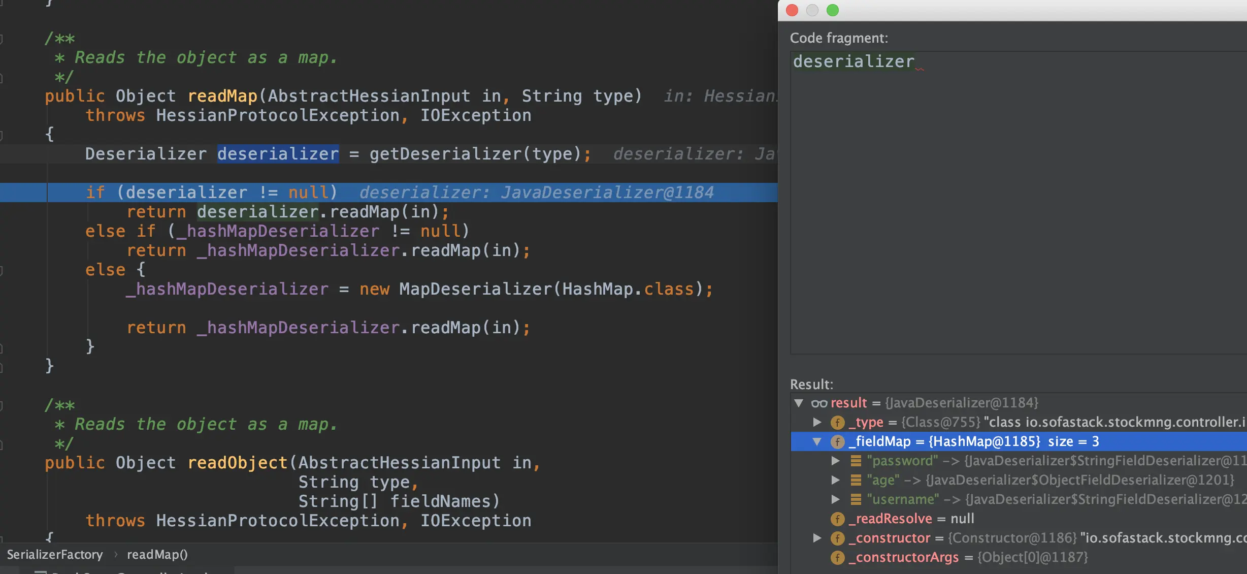 - hessian在反序列化的时候,是将对象所有属性取出来,存放在一个map中 key = 属性名 value是反序列类,相同名字的会以子类为准进行反序列化。
