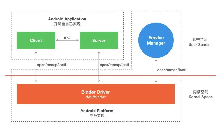 - Client、Server 和 ServiceManager 均是通过系统调用 open、mmap 和 ioctl 来访问设备文件 /dev/binder, 从而实现与 Binder 驱动的交互来间接的实现跨进程通信。