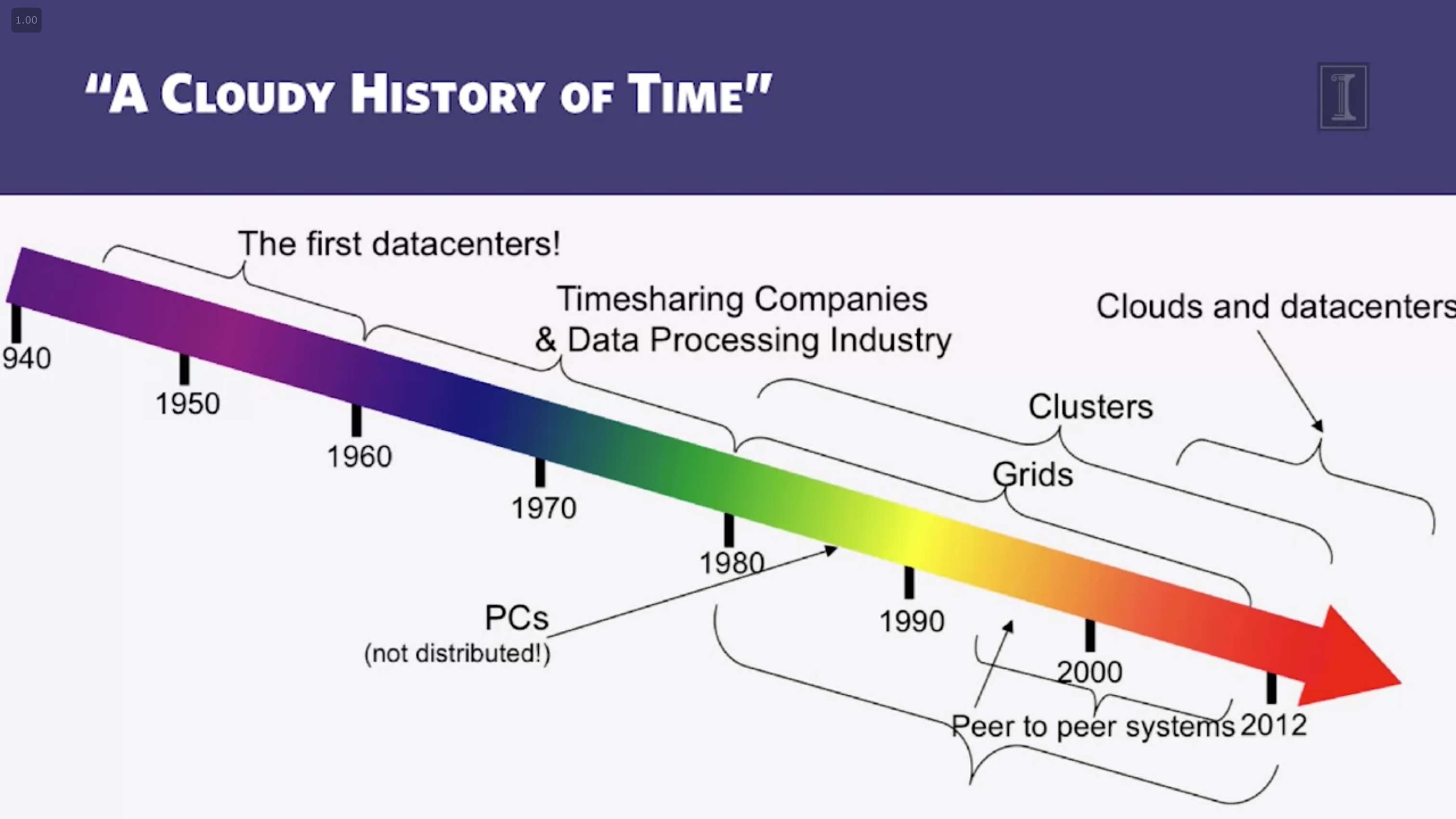 Cloud 学习笔记2.云计算的历史 s09g 2019-08-04 242 阅读1分钟 cloud history of time Time 代表 description 上世纪40年代至50年代 早期建造的计算机(ENIAC, ORDVAC, ILLIAC...) 占据了整栋大厂房或实验室 20世纪的60年代和70年代 分时系统和数据处理(标准的穿孔卡片) 大批量的数据处理(KB/MB级别) 1980年代 个人电脑 网格计算概念 1990到2000年之间 大规模系统 P2P(点对点)系统 现在 大规模集群 分时系统和海量数据处理