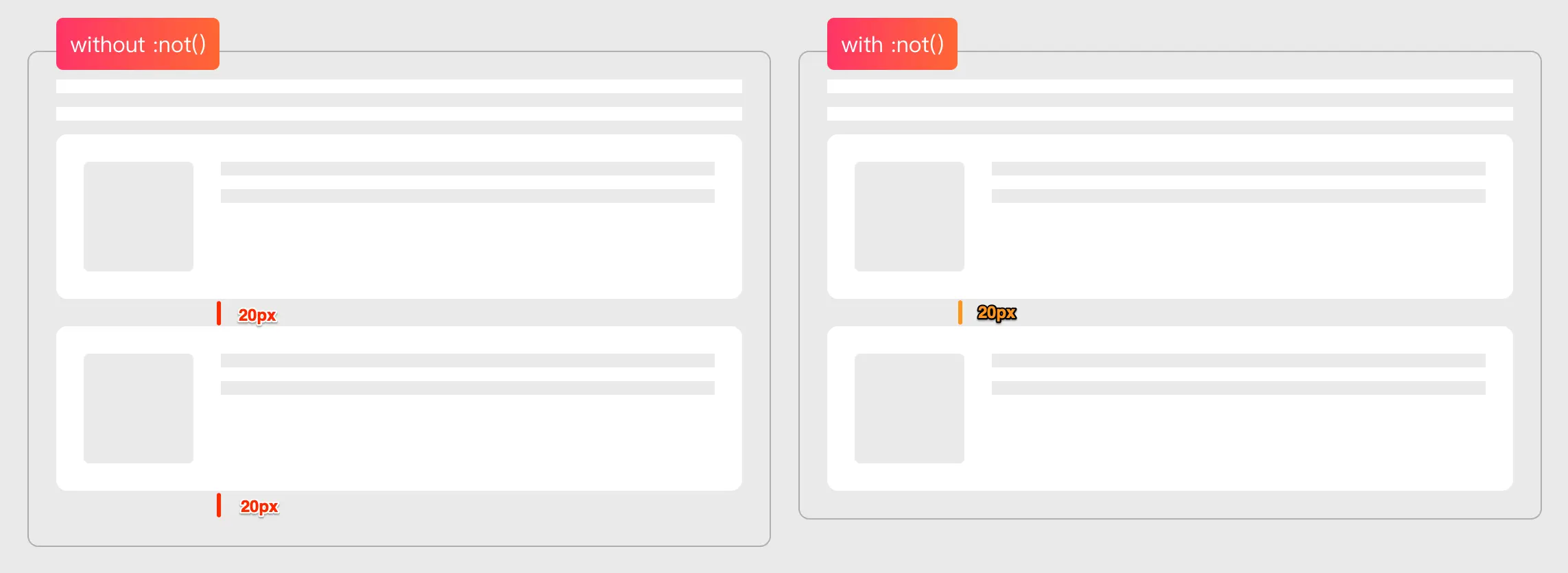 我们平时开发项目的时候,时常会碰到列表这样的效果,列表项之间有一个margin-bottom,而往往想在最后一项中不设置margin-bottom。比如像下图这样的效果: