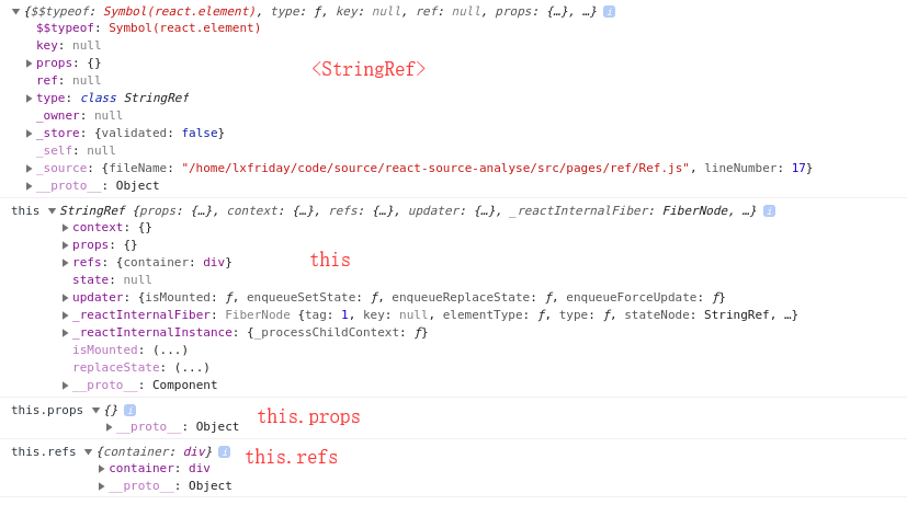<StringRef /> 是由 React.createlElement 产生的一个对象,自身不是实例,所以它和 this 存在区别。