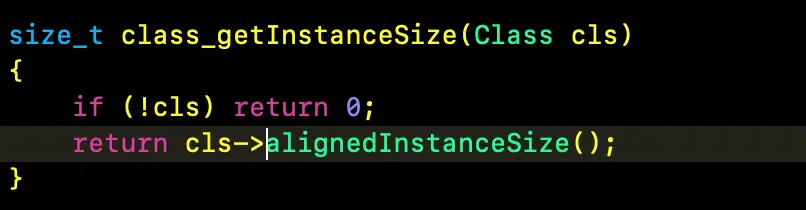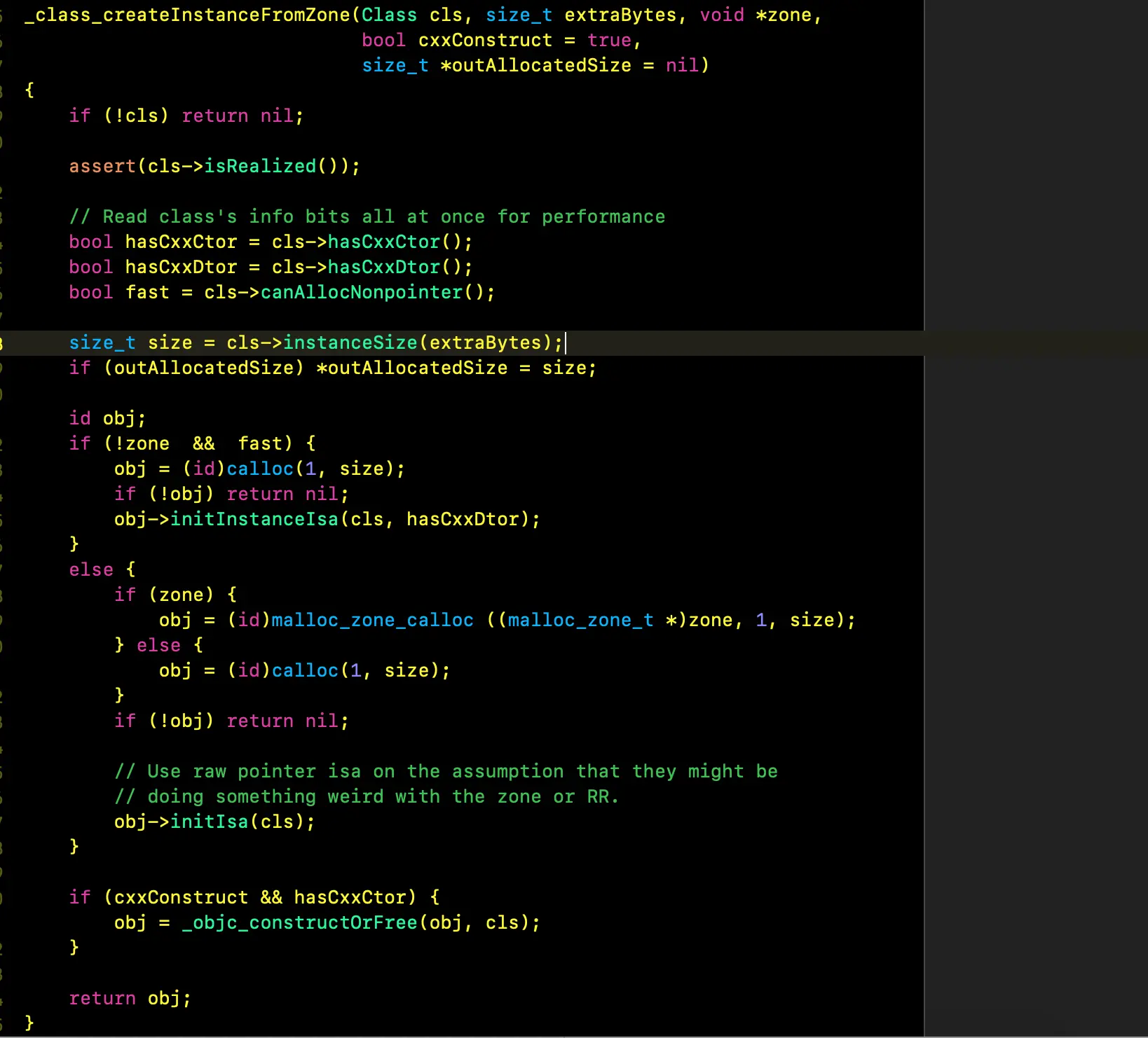 malloc_zone_calloc 或者 calloc 分配内存,而大小都是使用的 size_t size = cls->instanceSize(extraBytes); 这样一个方法来获取的大小,这个就是核心,那看看核心代码