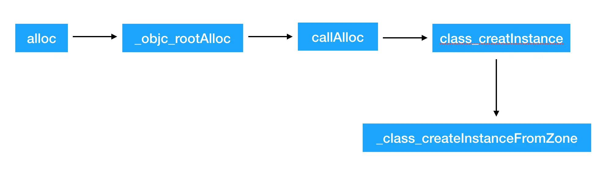 创建对象时候分配内存我们都是使用的 alloc 方法,在源码里,方法的调用顺序是这样的(allocWithZone 也类似,最终落点是一样的)