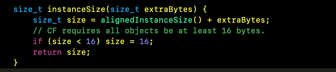 可以看到分配内存的时候,分配的大小就是 alignedInstanceSize + 额外传入的大小,而且当size小于16个字节时自动扩展到16个字节。