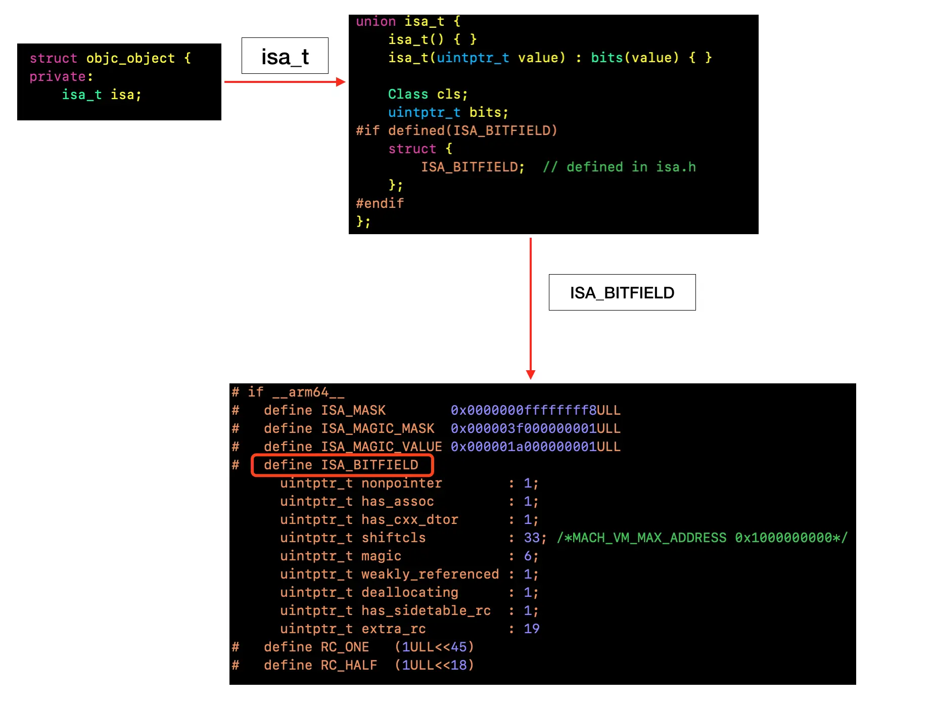 isa 在arm64架构之前,就是一个普通的指针,存储着 类Class 或者 元类meta-Class 对象的内存地址;但是从arm64之后,对isa进行了优化,变成了一个 union 共用体结构,与 struct 结构相似,但是 union 中多个成员共用一块内存,占用内存是是成员中长度最长的类型需要的内存大小。