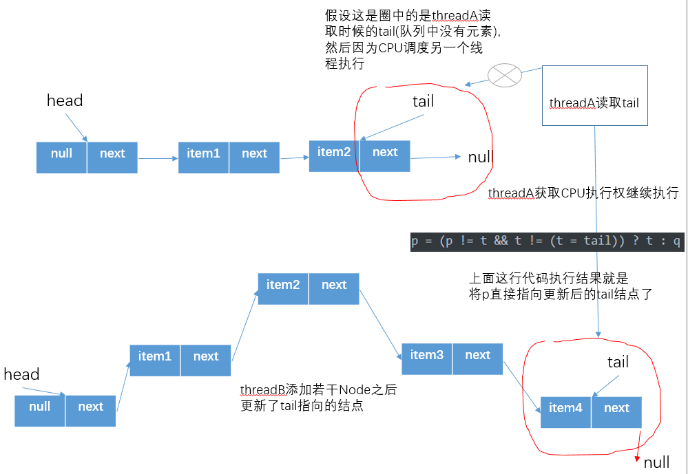 //q为尾节点的next结点,但是在多线程中,如果有别的线程修改了tail结点那么在本线程中可以看到p!=null(后