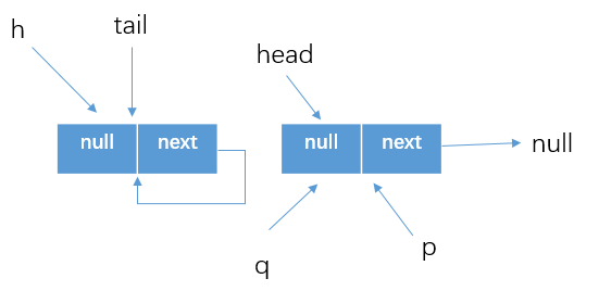 q=p.next,自然得到的就是p==q的结果了,所以这个时候就需要跳到外层循环重新获取最新的head结点,然后继续执行