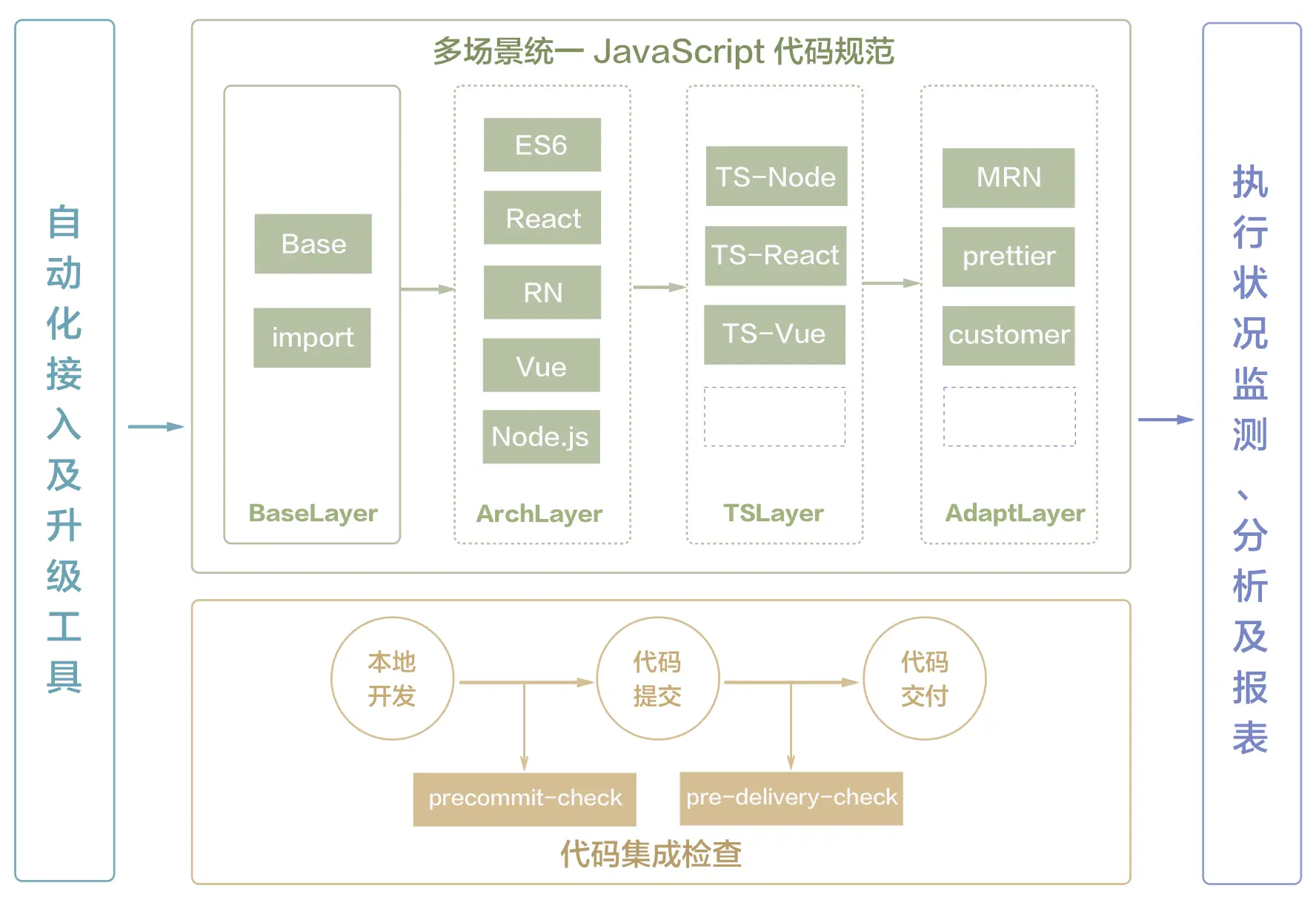- 框架支撑层(可选):提供对通用的一些技术场景、框架的支持,包括 Node.js、React、Vue、React Native等;这一层借助开源社区的各种插件进行配置,并对各种框架的规则都进行了一定的调整。