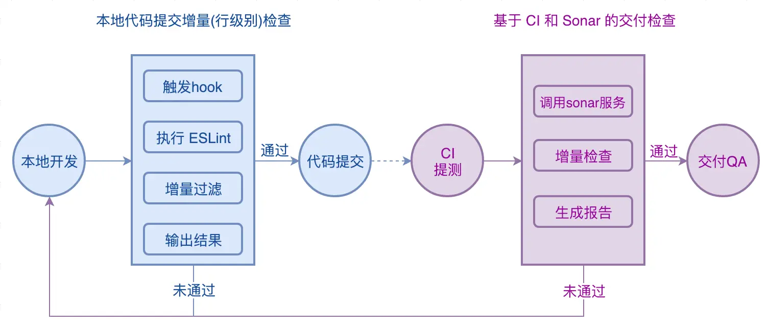 - 代码交付检查:在代码交付(借助 CI 系统的交付流程功能)时,在代码检测平台中对代码进行 ESLint 检查,检测不通过则阻断交付。其优点在于能够强制执行,可在线追踪检测报告;缺陷在于离开发者的开发环境太“远”,开发者响应处理成本较高。