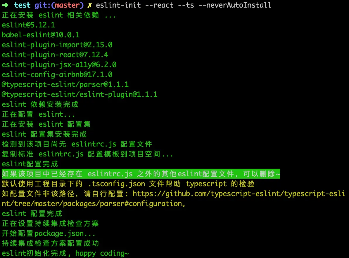 该工具流程简单,不管什么开发场景和框架选型,繁琐的接入流程都可以简化为一条命令,需要配合工程方案升级时同样如此。如下图所示,执行该命令后项目就完成了 ESLint 的接入,使用统一的规则规范编码,同是在代码提交时自动进行增量检查: