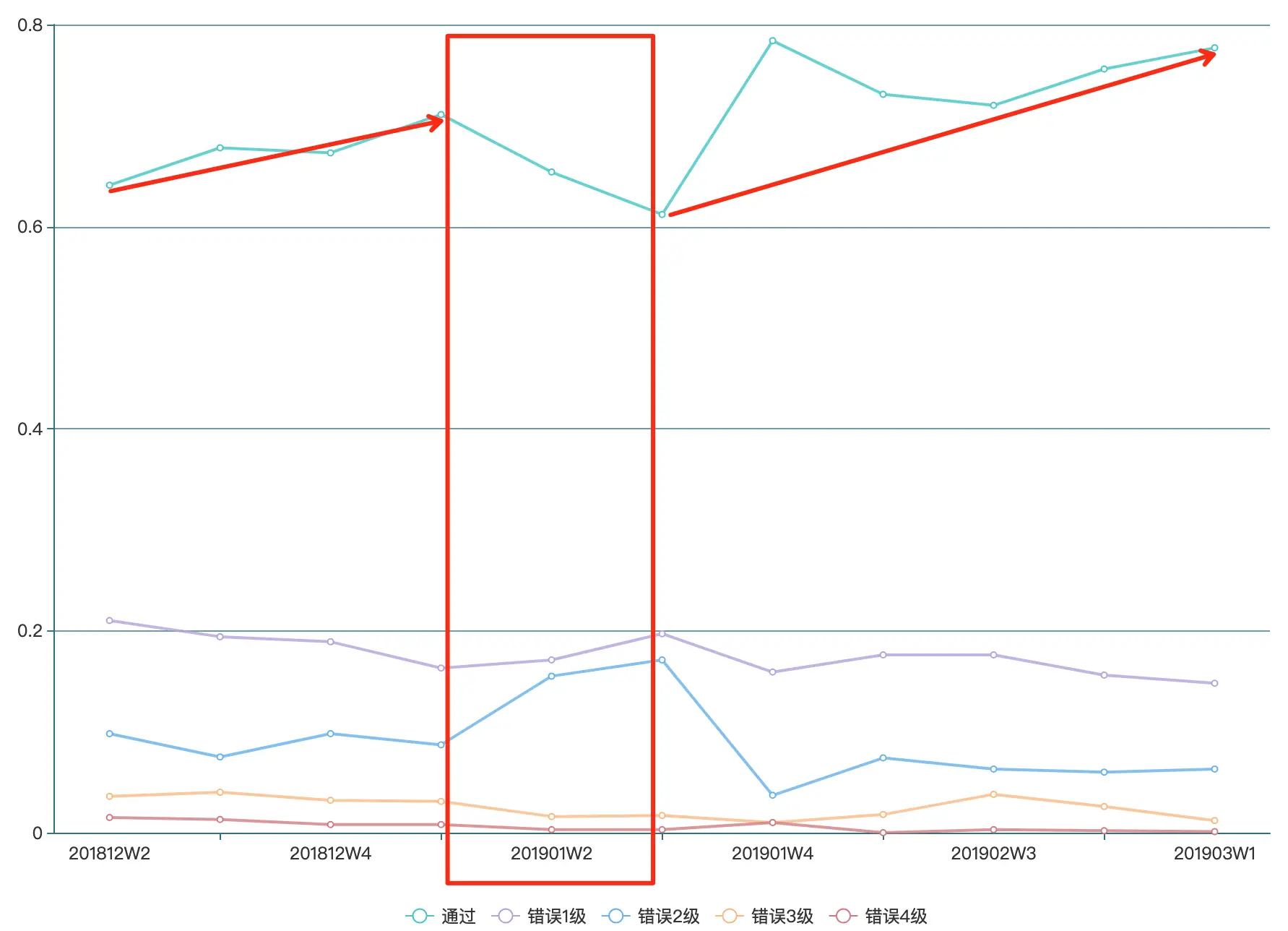同时,我们持续统计上述数据的变化趋势,跟踪代码质量提升效果,以2018年12月到2019年3月的数据为例(截止2019年3月第一周,以周为时间统计尺度):