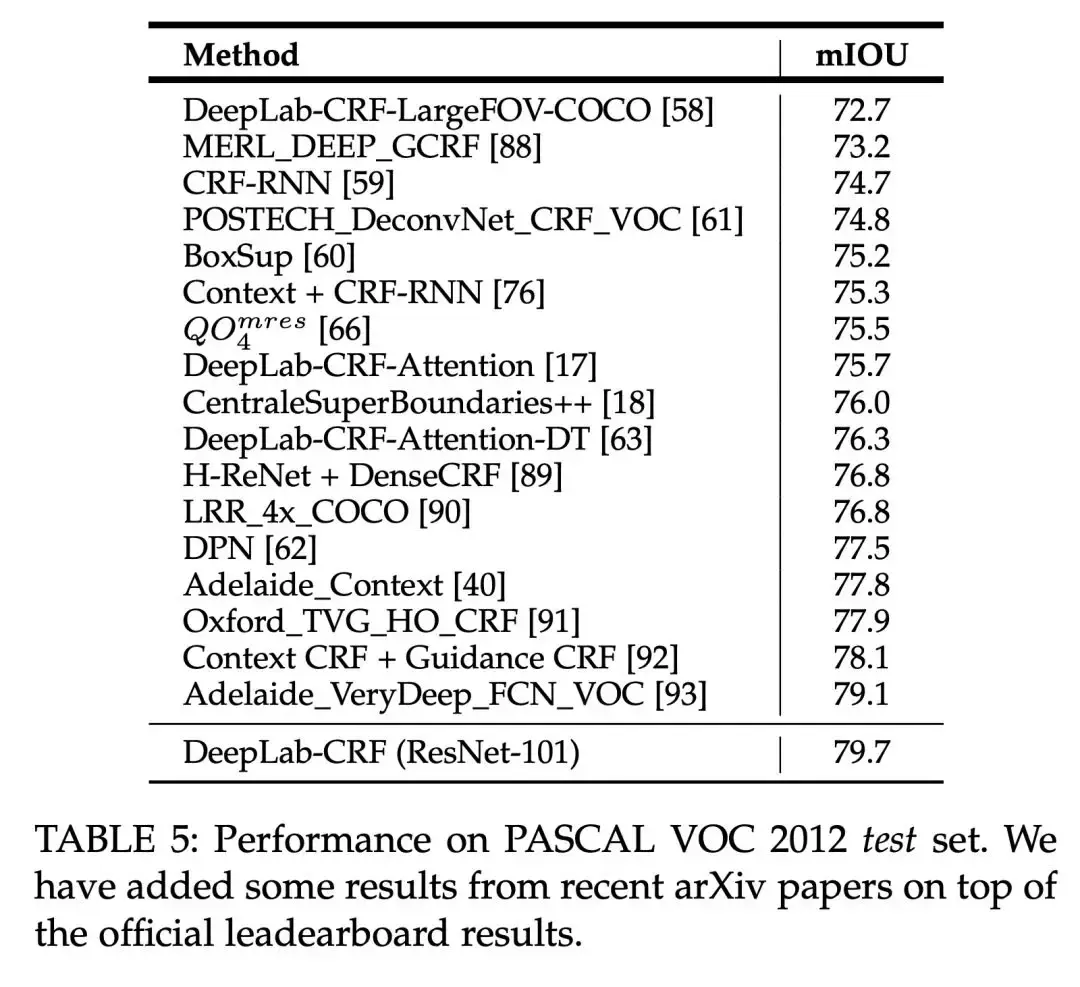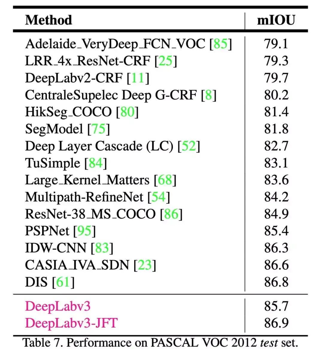 在没有密集条件随机场(DenseCRF)的情况下,论文的 DeepLabv3 版本在 PASCAL VOC 2012 测试集上实现了 85.7% 的性能。
