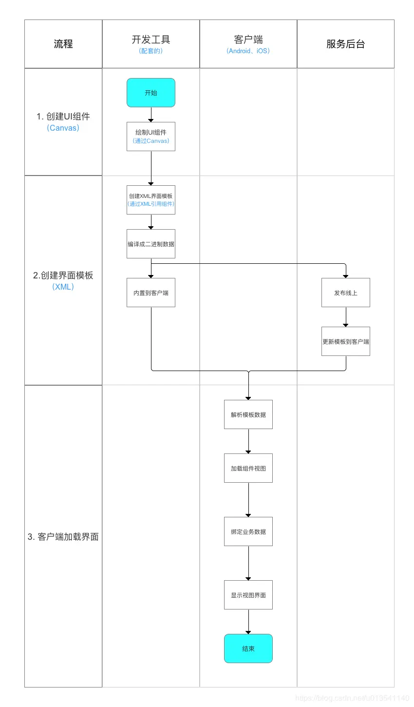 VirtualView的工作流程分为3大部分:创建UI组件、创建界面模板和客户端加载界面,具体如下: