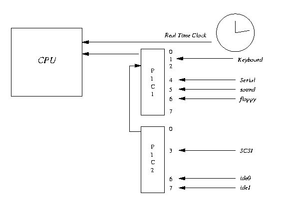 以键盘为例,当用户按下键盘某个按键时,键盘会给 CPU 的中断引脚发出一个高电平,CPU能够捕获这个信号,然后执行键盘中断程序。下图展示了各种硬件通过中断与 CPU 交互的过程。