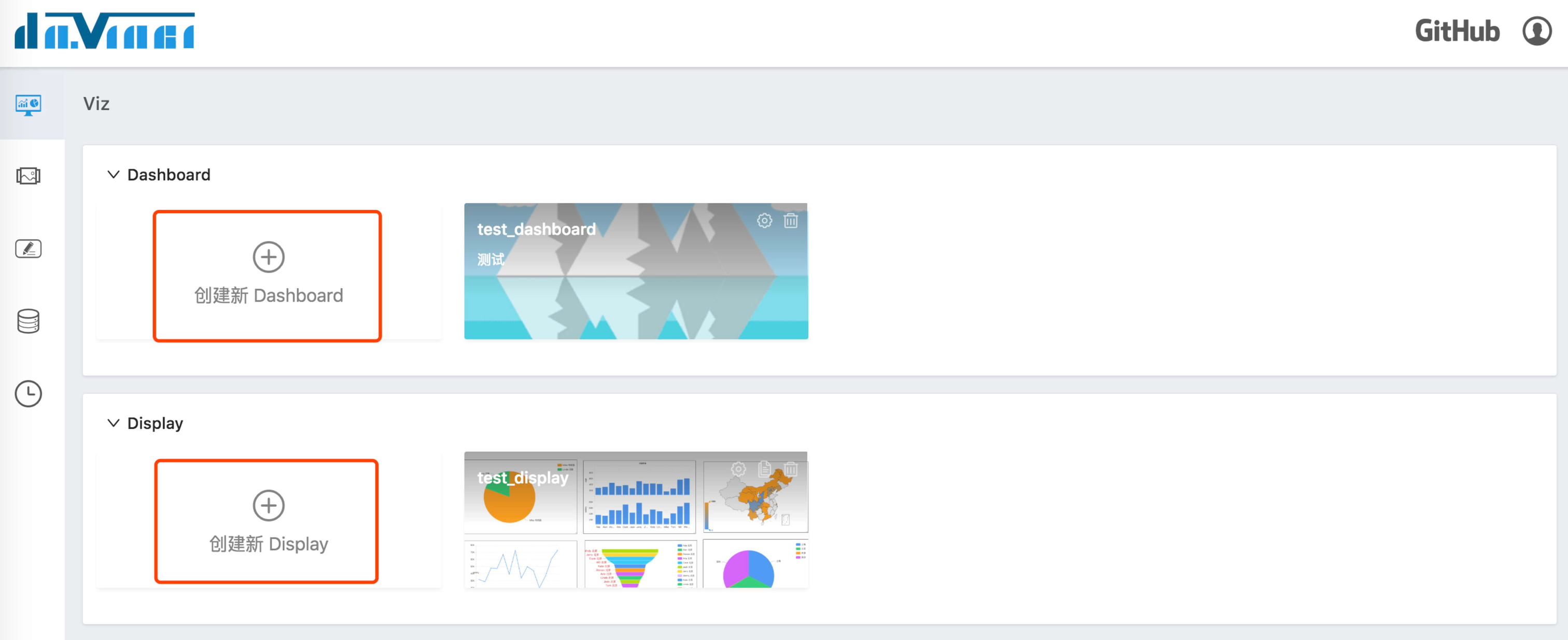 进入 Viz 页,创建 Dashboard 和 Display 应用层。