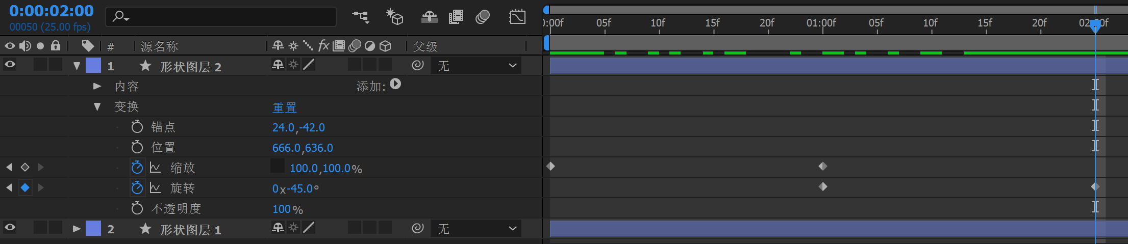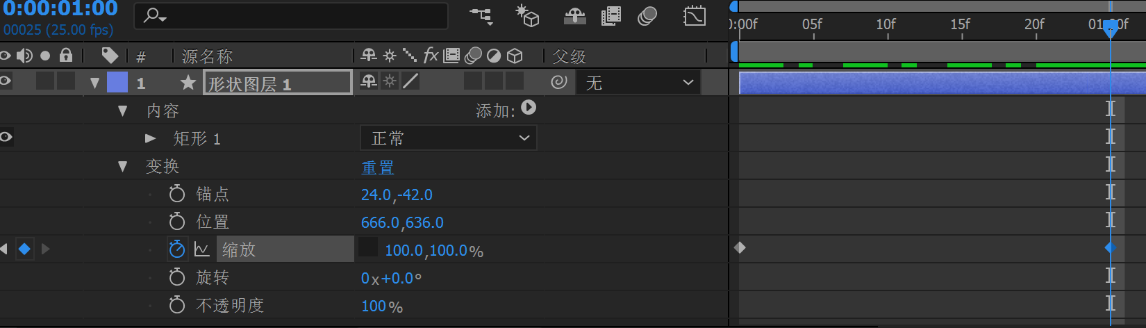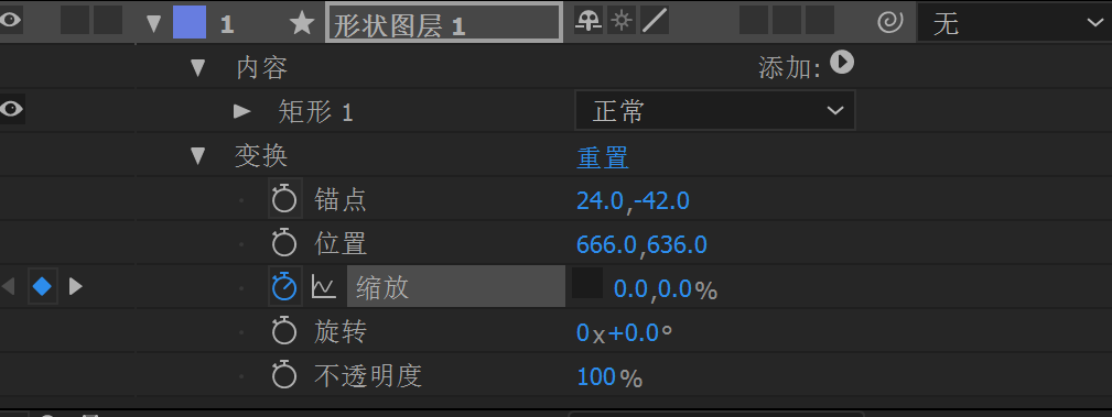 AE入门学习 前端研究猿 2019-08-05 632 阅读1分钟 简单动画制作 最终实现效果: 从隐藏-显示-由小变大-旋转 1、新建项目——新建合成。 2、选择工具栏中的圆角矩形工具,在舞台(画布)上画一个矩形。 3、选择工具栏中的向后平移(锚点)工具,把刚刚画好的矩形图锚点移到图中间位置。 4、选择缩放,并右键添加关键帧 5、选中缩放,取消约束比例,并将值改为0。 6、移动时间指示器,移至01:00f,继续添加缩放关键帧,并将缩放比例值改为100。 7、选中形状图层1,Ctrl+C,Ctrl+V复制一个矩形。 8、选中图形1下的变换中的旋转,指示器移到01:00f位置,选中旋转,右键单击添加关键帧,旋转值默认不变;再将指示器移至02:00f位置,同上步骤,再添加一个旋转关键帧,将值改为45°。 9、选中图形2下的变换中的旋转,同第8步骤,在1秒位置添加关键帧,值默认不变,然后再2秒位置再添加关键帧,将值改为-45°,动画就完成了。
