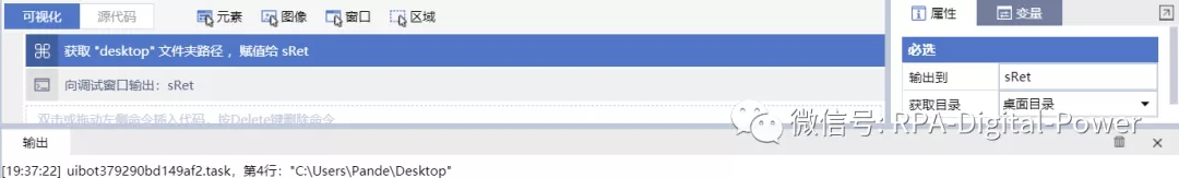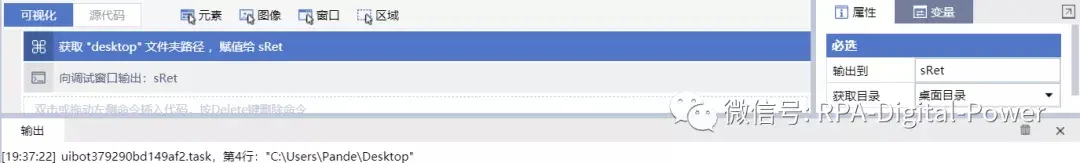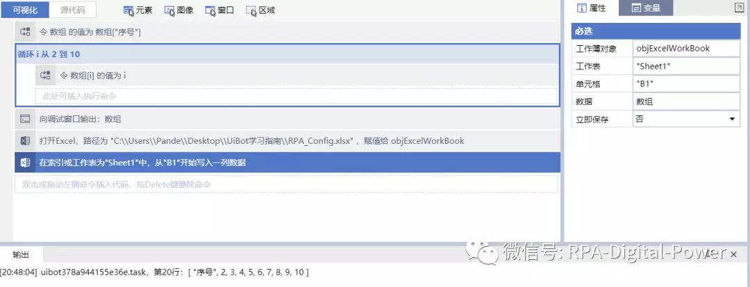 数组 假如我们想从Excel中取出数量不固定的若干个银行账户,并把它放在数组里面,进行循环处理。 第一步:打开Excel 打开之前 ,先配置文件路径 。这个文件路径需要灵活处理,就像我之前讲信息配置表的处理一样,获取桌面文件存放的路径。(UiBot可视化视图)