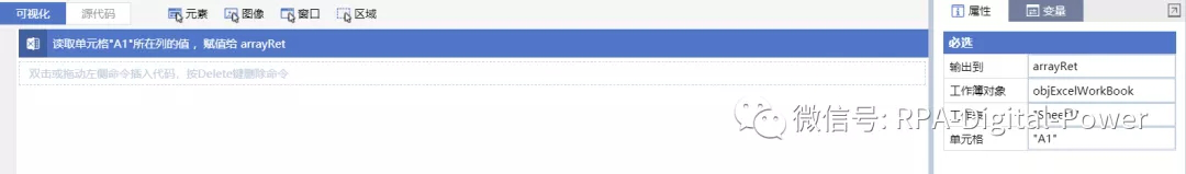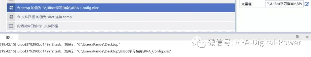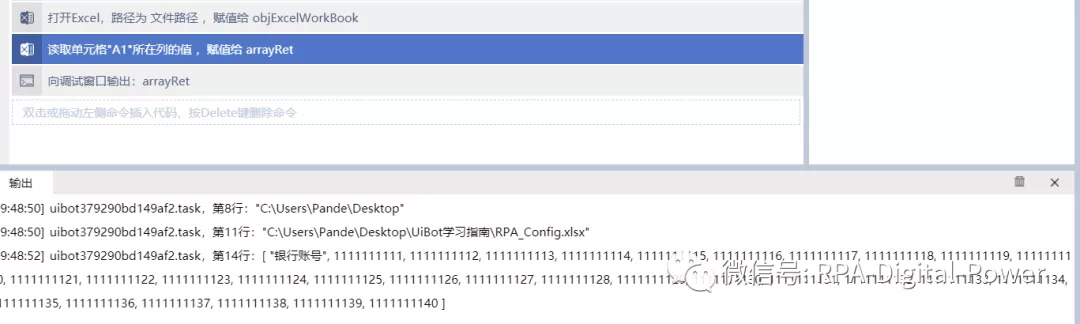 (UiBot源码视图) ========Start======== dim sRet = "" dim temp = "" sRet = Sys.GetSystemPath("desktop") dim 文件路径 dim objExcelWorkBook = "" dim arrayRet = "" dim arrRet = "" TracePrint(sRet) temp = "\UiBot学习指南\RPA_Config.xlsx" 文件路径=sRet&temp TracePrint(文件路径) objExcelWorkBook = Excel.OpenExcel(文件路径,true) arrayRet = Excel.ReadColumn(objExcelWorkBook,"Sheet1","A1") TracePrint(arrayRet) arrRet = Filter(arrayRet,"银行账号",false) TracePrint(arrRet) ========End========