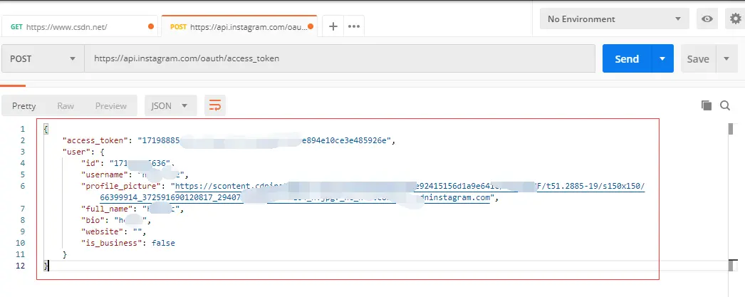点击send,就会得到下面的json,其中access_token你要的,下面是用户的简要信息
