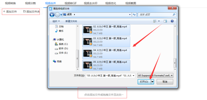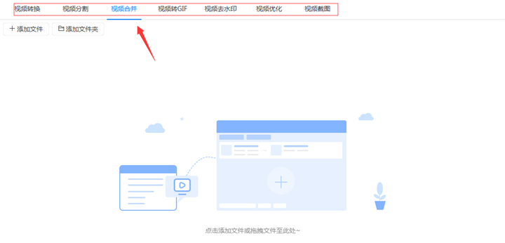 第二步:把需要合并成一个视频的多个视频添加到软件中。合并的时候可以点击软件左上角的“添加文件”或“添加文件夹”按钮,也可以用拖拽的方式直接把视频添加到软件中。以上多种添加方式都可以批量添加文件或文件夹,可以根据个人喜好选择添加方式。