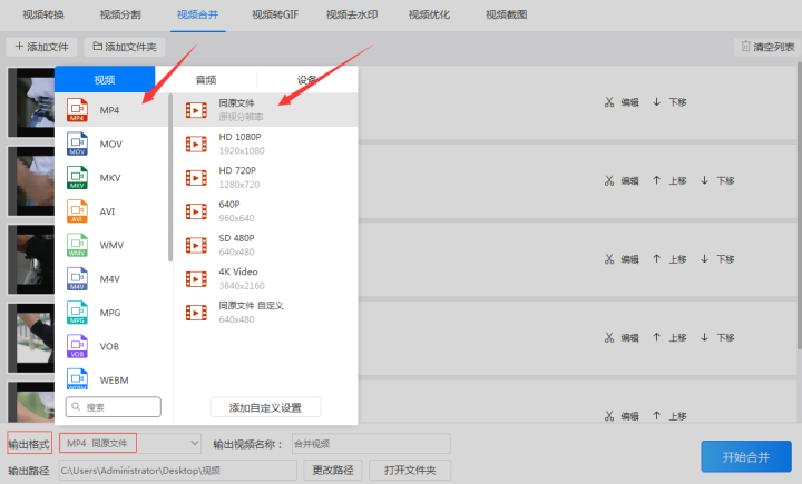 第三步:点击“输出格式”按钮设置输出的视频格式和输出的视频分辨率。由于在诸多视频格式中相比之下mp4由于占用内存小且兼容性相对较高的优点,因此在选择视频格式时通常选择为‘mp4’格式。而视频分辨率通常选择为和原视频相同分辨率的‘同原文件’格式。