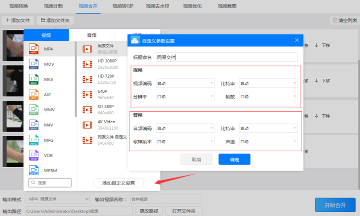 第四步:如果“mp4同原文件”格式或软件预设的参数不能满足使用需求可以点击“添加自定义设置”按钮自行设置视频(视频编码、比特率、分辨率、帧数)和音频(音频编码、比特率、取样频率、声道)的各项参数以满足使用需求。