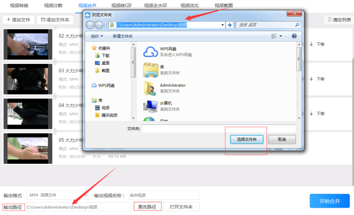 第五步:点击“输出路径”按钮设置视频合并后的文件输出到电脑的路径。在设置输出路径时可以在输入框中直接写入路径也可以把路径复制下来然后粘贴到输入框中,或者点击输入框边上的“更改路径”按钮选择要输出到电脑的路径。