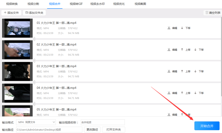 第六步:点击“视频合并”按钮把软件列表的视频从上到下依次合并视频。合并好后只需到之前预设的输出路径找到文件即可。