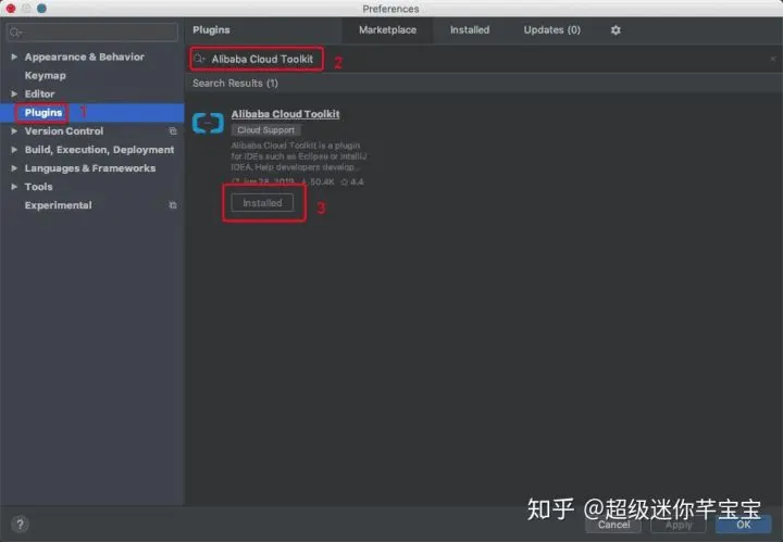 安装完毕,重启 IntelliJ IDEA,再次访问 Preference, 可以看到左侧菜单出现了 Alibaba Cloud Toolkit,在已安装的插件里面也能找到。