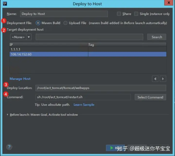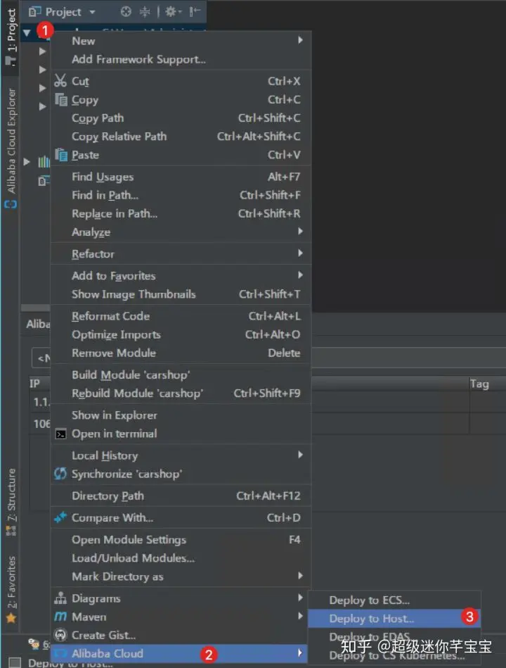 在 IntelliJ IDEA 中,鼠标右键项目工程名,在出现的菜单中点击 Alibaba Cloud - Deploy to Host...,会出现如下部署窗口: